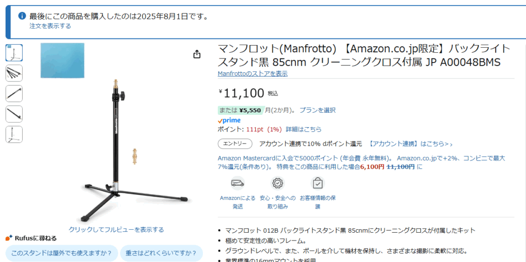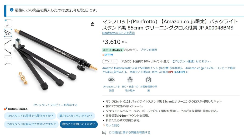 ユーザーが投稿した投稿 2025年8月4日 by NAOFUMI こないだAmazonの値段バグで3,605円で買えたマンフロットのスタンド、意外と良さそう。もう1個買おうと思ってページ見たら、値段戻ってた…。