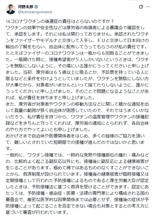 気になったのは、あくまで言葉と論理の整合性だ。ワクチン行政の制度設計や救済制度の説明としては筋が通っている。しかし同時に、過去に本人が公に使ってきた「私が責任を取る」「すべての責任を引き受ける」といった強い表現と、今回のポストで示される「制度上ここまで」という切り分けとの間に、国民の側で矛盾として立ち上がってしまうギャップがある。
