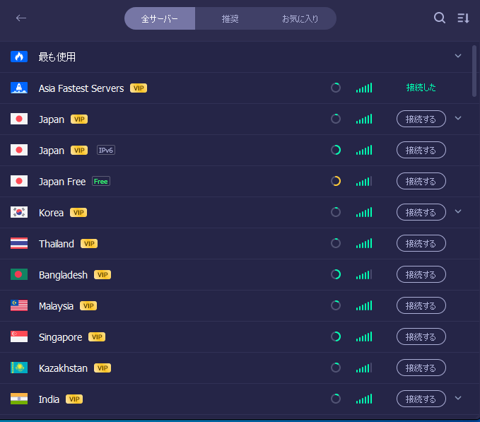 接続すると上記のような画面になり、VPN 上の IP アドレスが表示されます。利用できる VPN サーバーは世界中にありますが、中国の VPN は利用できません。なので中国で利用できるようなファイルダウンロードサービスの SMS 認証などは利用できないでしょう