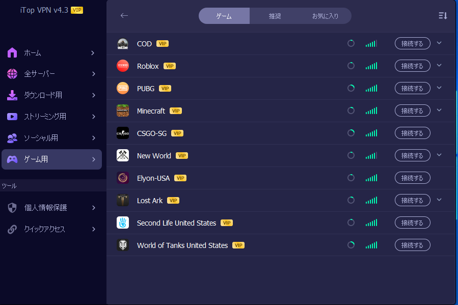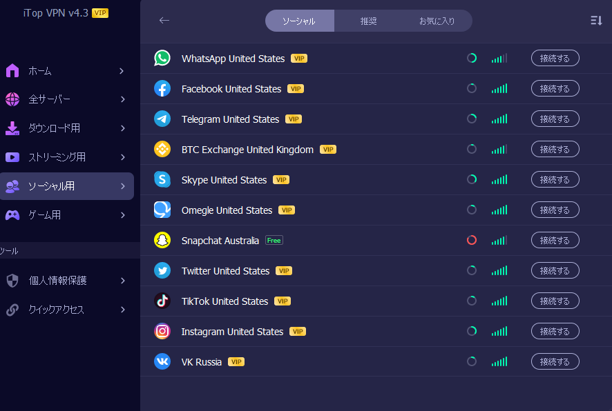 サーバーの種類もいろいろ用意されておりストリーミング用や、SNS 用や、ゲーム用の VPN サーバーが用意されています