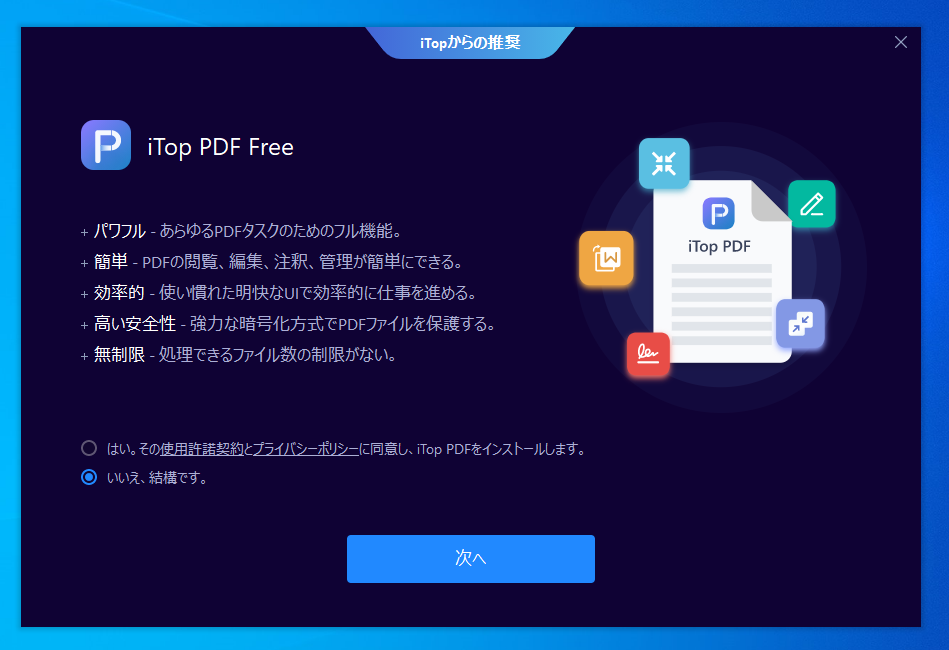 次によく分からないソフトをセットでインストールさせようとしてくるのでこちらは「いいえ結構です」を選び次へを押しましょう