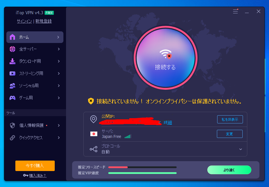 自動的にソフトが起動します。最初に自分が利用しているプロバイダー、接続している IP アドレスが表示されています。